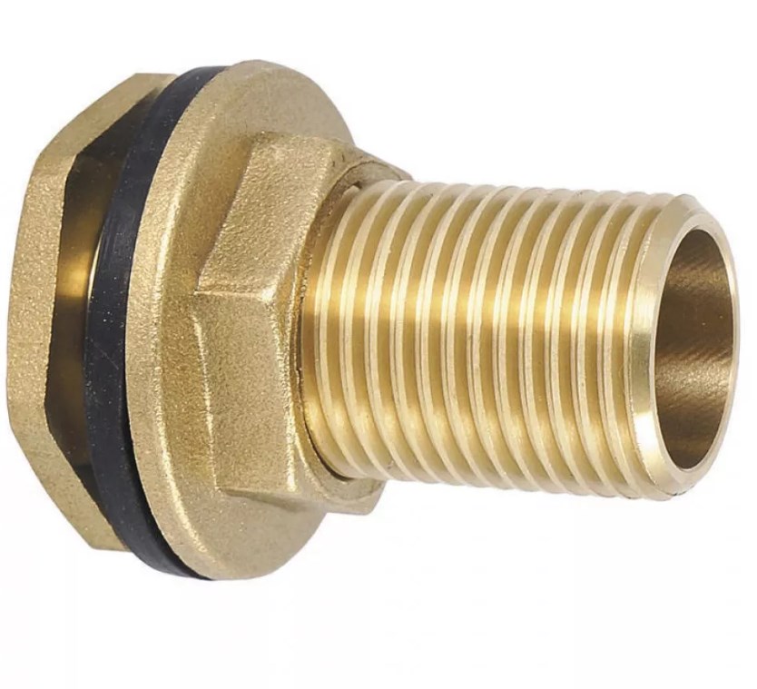 Штуцер, врезка в бак (емкость) с прокладкой латунь с контргайкой служит для соединения резьбовых фитингов и устройств с пластиковым баком. Обеспечивает превосходные герметичные свойства с помощью зажимной гайки и отвода с наружной резьбой.