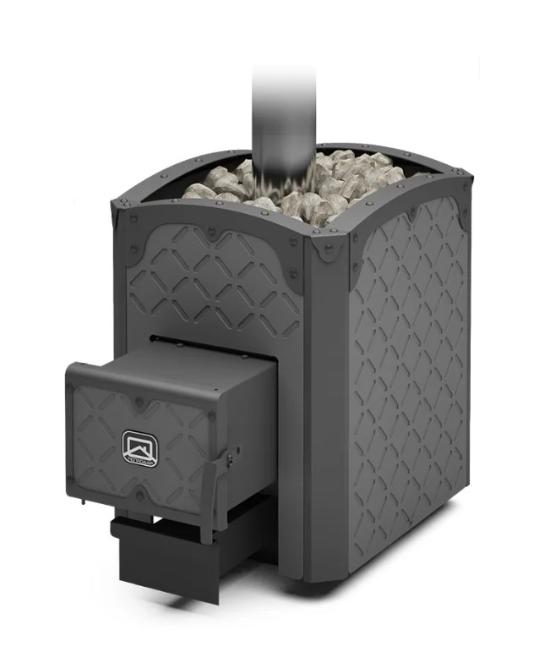 В оформлении использованы угловые набойки с массивными заклепками, добротные широкие ленты металла окаймляют вместительную каменку, в орнаменте конвектора узнаются элементы художественной ковки и даже очертания звеньев кольчуги.