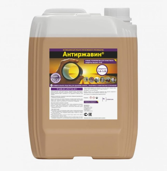 Средство представляет собой оптимизированную смесь минеральных и органических кислот, комплексонов, эффективных ингибиторов коррозии, функциональных добавок. В состав «Антиржавина» входит ряд новых компонентов, благодаря которым средство растворяет отложения значительно быстрее и эффективнее, чем минеральные кислоты, а коррозионное воздействие на металлы в несколько раз ниже (и не превышает допустимых значений).